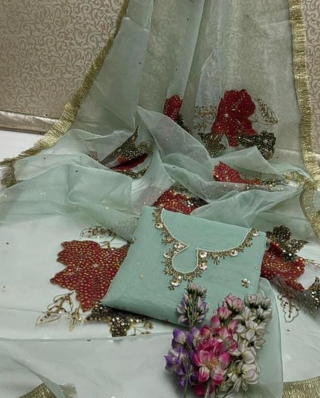 Beautiful 2-piece Zari Tilla embroidered suit, perfect for festive occasions and parties.